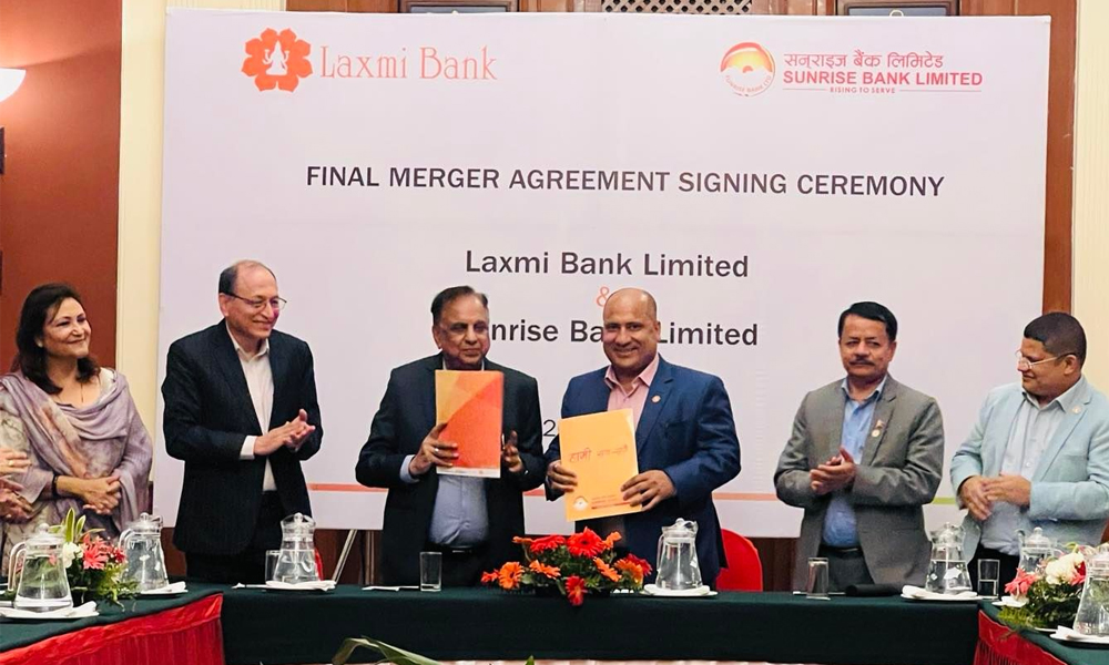 काठमाडौं । लक्ष्मी बैंक र सनराइज बैंकबीच मर्जर सम्बन्धमा अन्तिम सम्झौता सम्पन्न भएको छ ।सोमबार लक्ष्मी बैंकको तर्फबाट सञ्चालक दिनेश पौड्याल तथा सनराइज बैंकको तर्फबाट