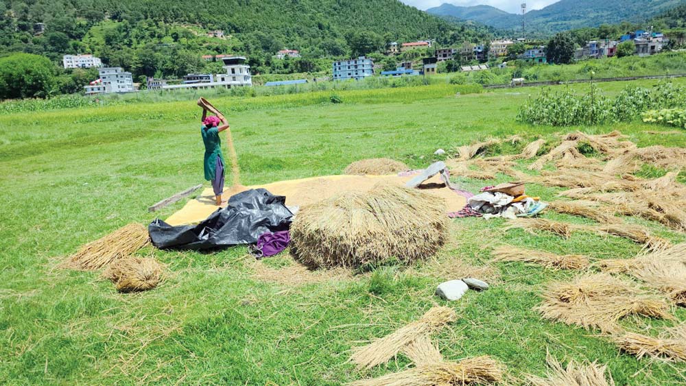अछाम । आकासे पानीको भरमा रोपाइँ हुने केही ठाउँमा भने धान रोप्न अझै बाँकी रहँदा अछामको साँफेबगरका एक किसानको खेतमा साउनमै धान पाकेको छ । साँफेबगरस्थित